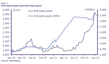 Nel frattempo, per fortuna, Mario Draghi sta tenendo a galla le banche e il sistema monetario europeo. Il bilancio della BCE ha oramai raggiunto le dimensioni di quello gestito dalla Federal Reserve americana ed è pieno di titoli “spazzatura”, a partire dai bond di Grecia e Portogallo. Mario Monti, a chi gli chiedeva conto delle opinioni di tanti economisti secondo i quali l’unica soluzione alla crisi sarebbe che la Bce diventi prestatore di ultima istanza, ha risposto ”credo che si possa assistere ad una evoluzione”.